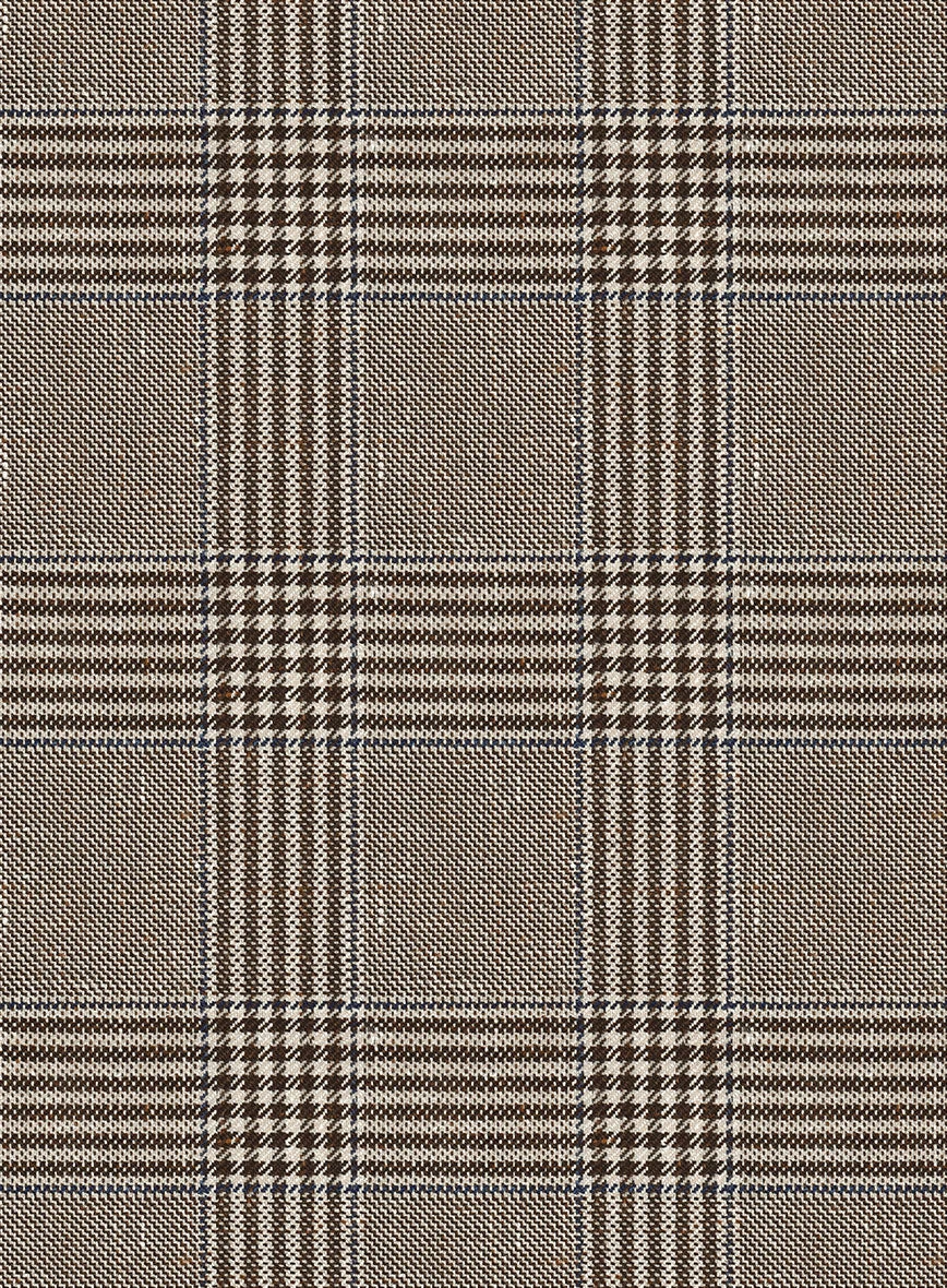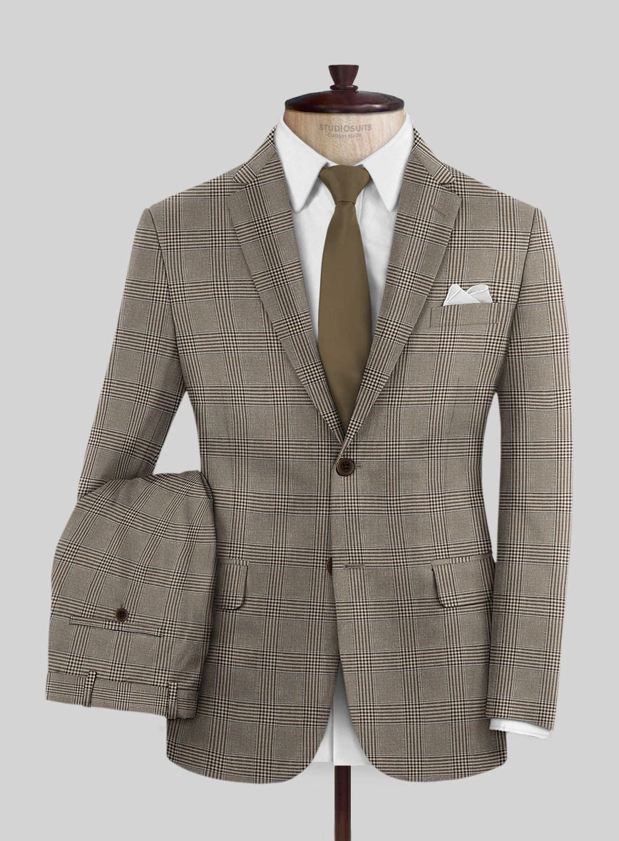 Look features a 2 button jacket with notch lapels, horn brown buttons, single vent, two cuff buttons, and two welted back pockets on trousers.