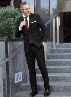 Look features a 2 button jacket with notch lapels, horn royal black buttons, single vent, three cuff buttons, and two welted back pockets on trousers.