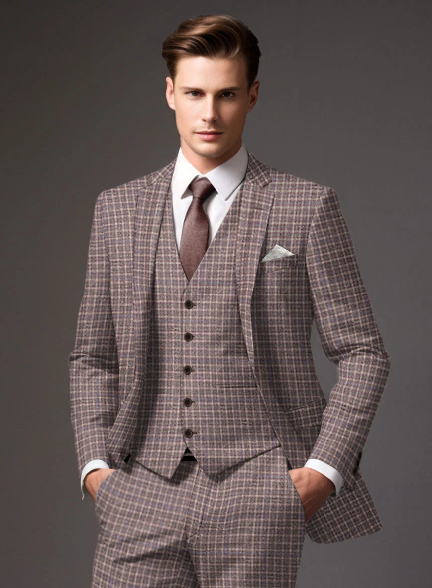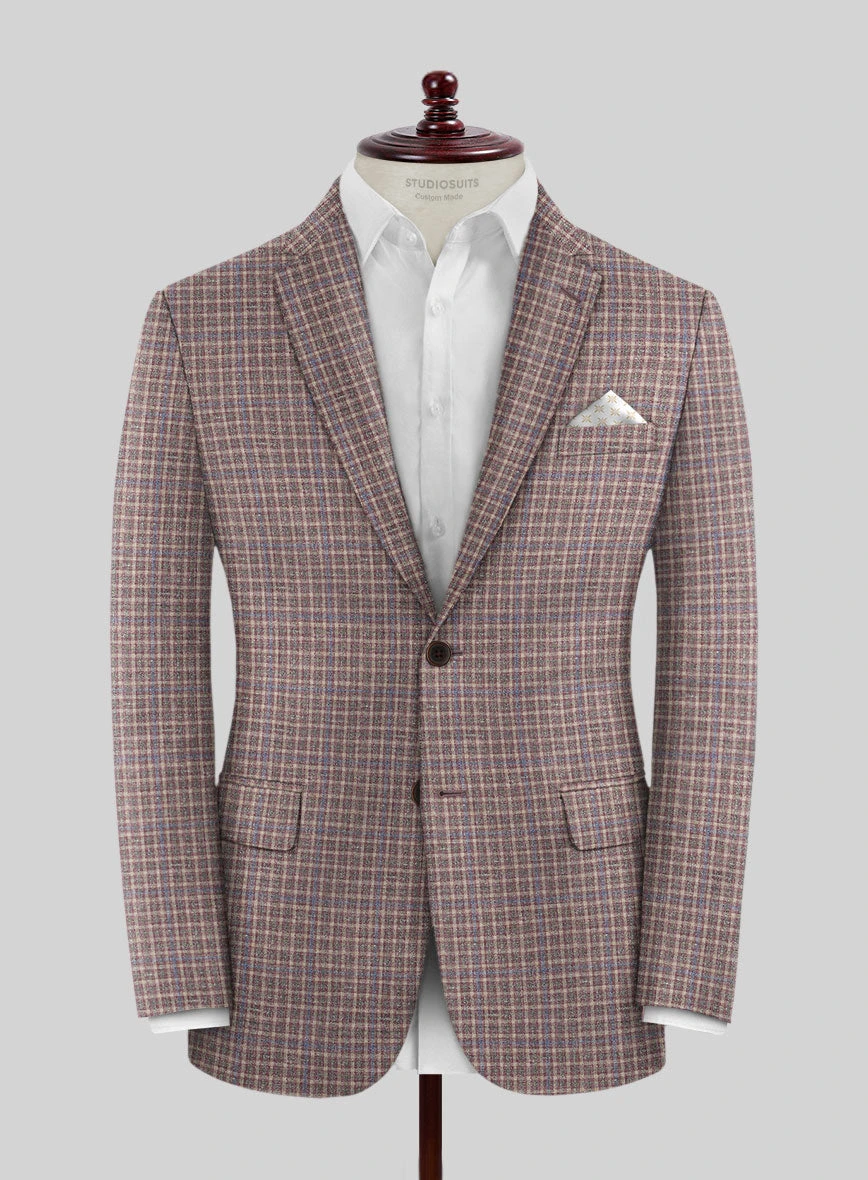 Look features a 2 button jacket with notch lapels, horn brown buttons, single vent, three cuff buttons.